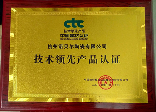 技术领先产品认证是由中国建材检验认证集团组织相关专家编制,经国家认监委批准的第三方认证,该认证是对企业研发技术能力、生产工艺技术、企业研发管理制度等综合能力的评价,是行业目前唯一对技术领先产品认证的第三方权威发布,诺贝尔瓷砖申请的瓷抛砖产品是目前行业唯一荣获“技术领先产品认证”的产品。